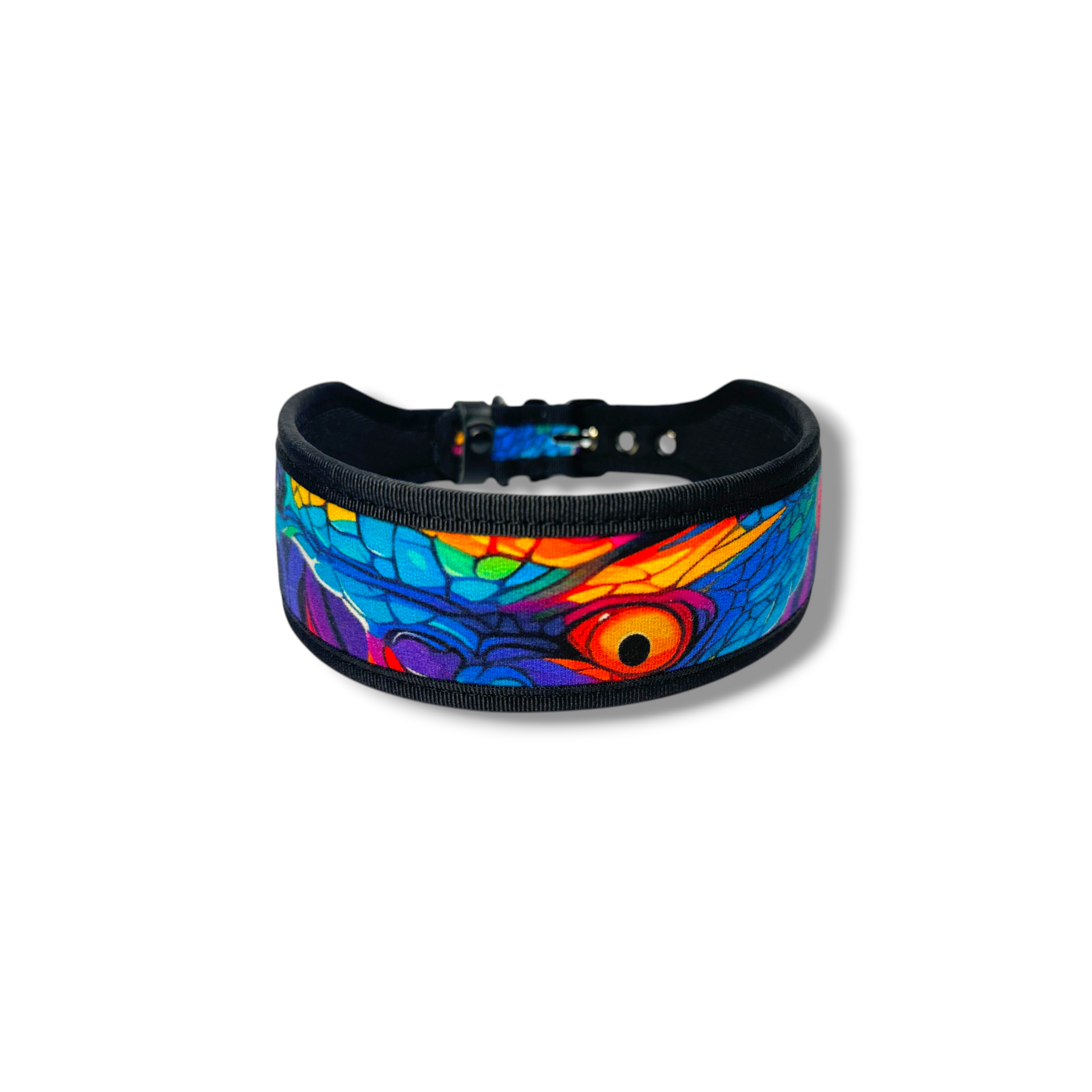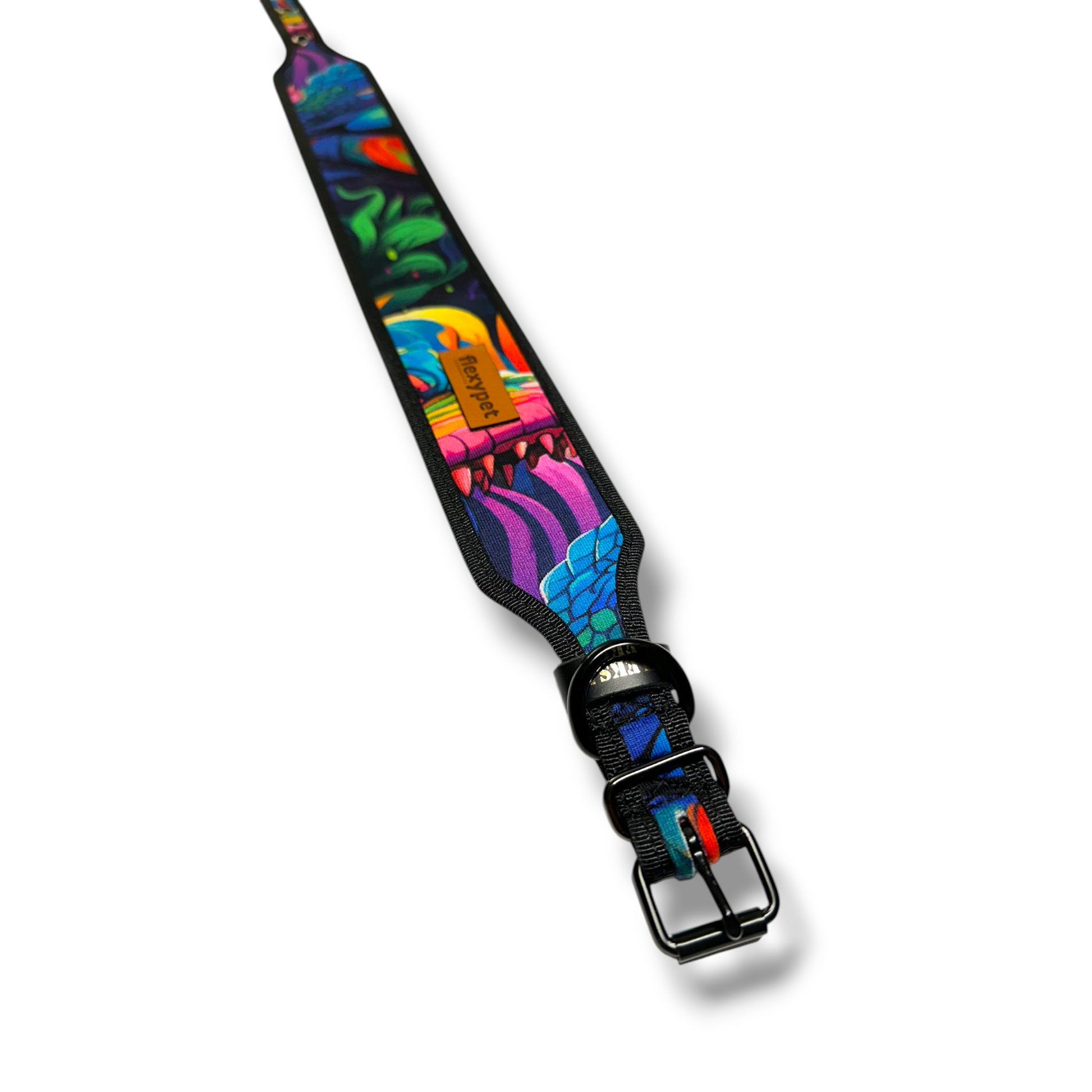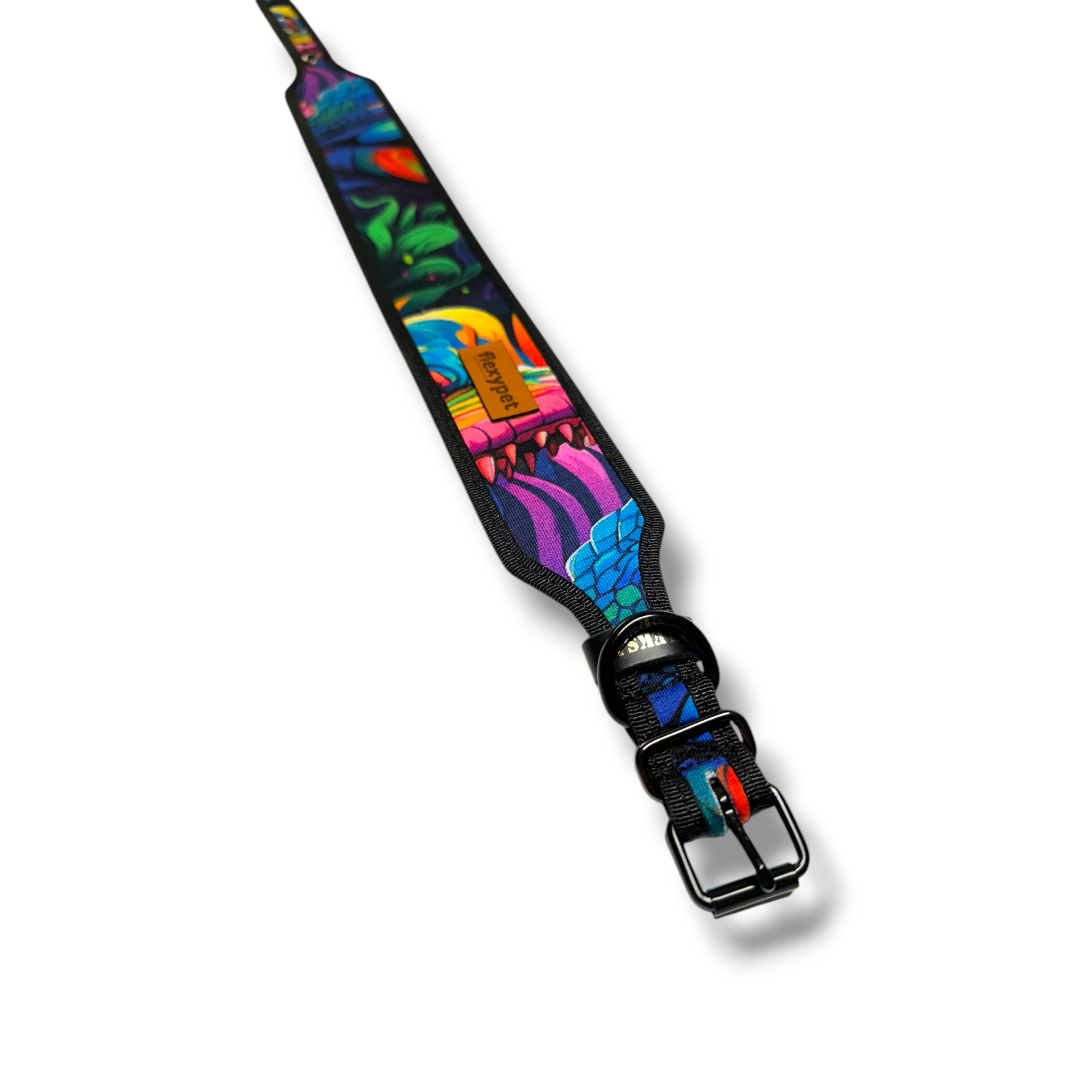 Fabric collar for larger dogs: Vibrant outer layer stitched with reflective threads, soft breathable inner lining, and durable metal buckle. Tailored for larger breeds, offering a snug fit without restricting movement. Designed for daily wear. Crafted with polyester, neoprene, metal, and elastane. Available in multiple sizes for easy selection.