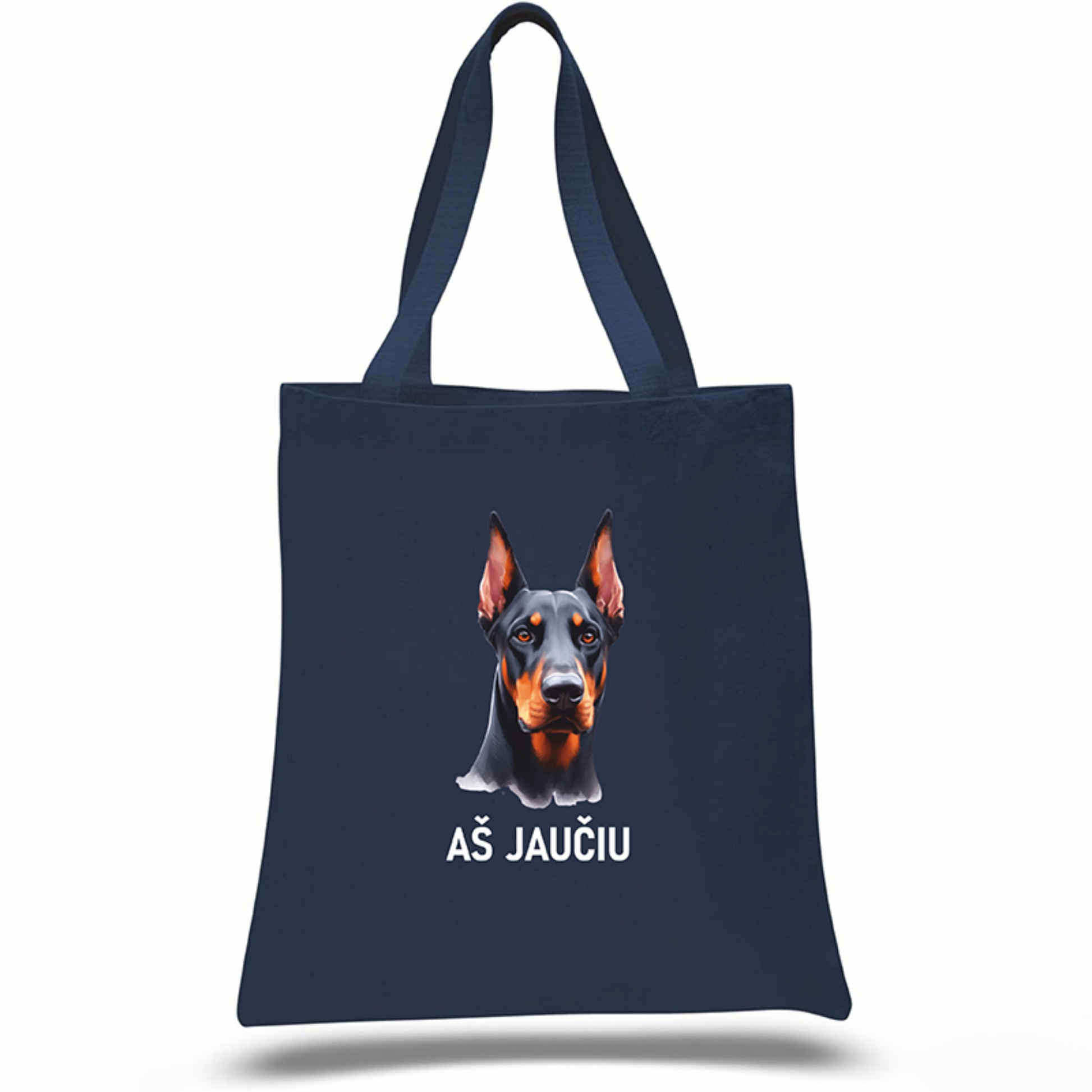 Atraskite patogumą ir tvarumą viename – šis klasikinio dizaino tamsiai mėlynas medvilninis maišelis su Dobermano veislės nuotrauka yra puikus pasirinkimas kasdieniam naudojimui. Pagamintas iš 100 % natūralios medvilnės, maišelis yra lengvas, tačiau pakankamai tvirtas nešioti tiek asmeninius daiktus, tiek pirkinius. Dėl ilgų rankenų jį patogu nešioti tiek rankoje, tiek ant peties.